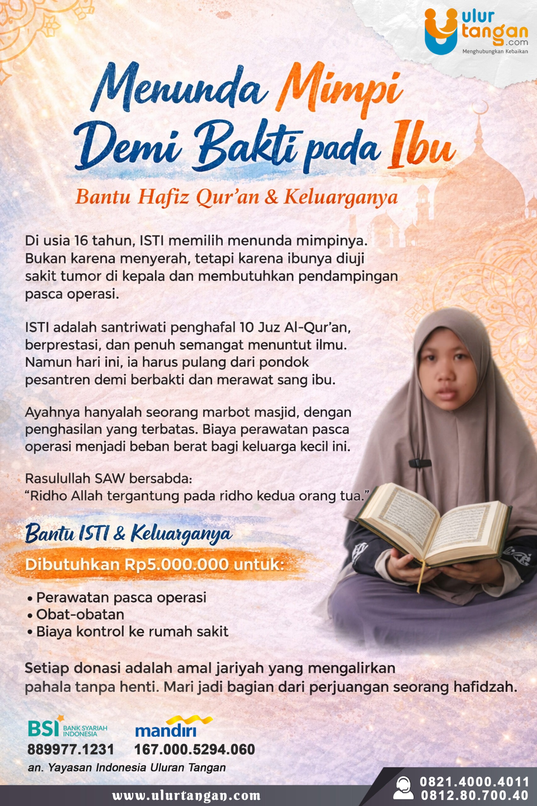 Ayah ISTI, Pak Hidayat, hanyalah seorang marbot masjid dengan penghasilan yang sangat terbatas. Di tengah kondisi ekonomi yang pas-pasan, biaya perawatan pasca operasi menjadi beban yang begitu berat bagi keluarga kecil ini.