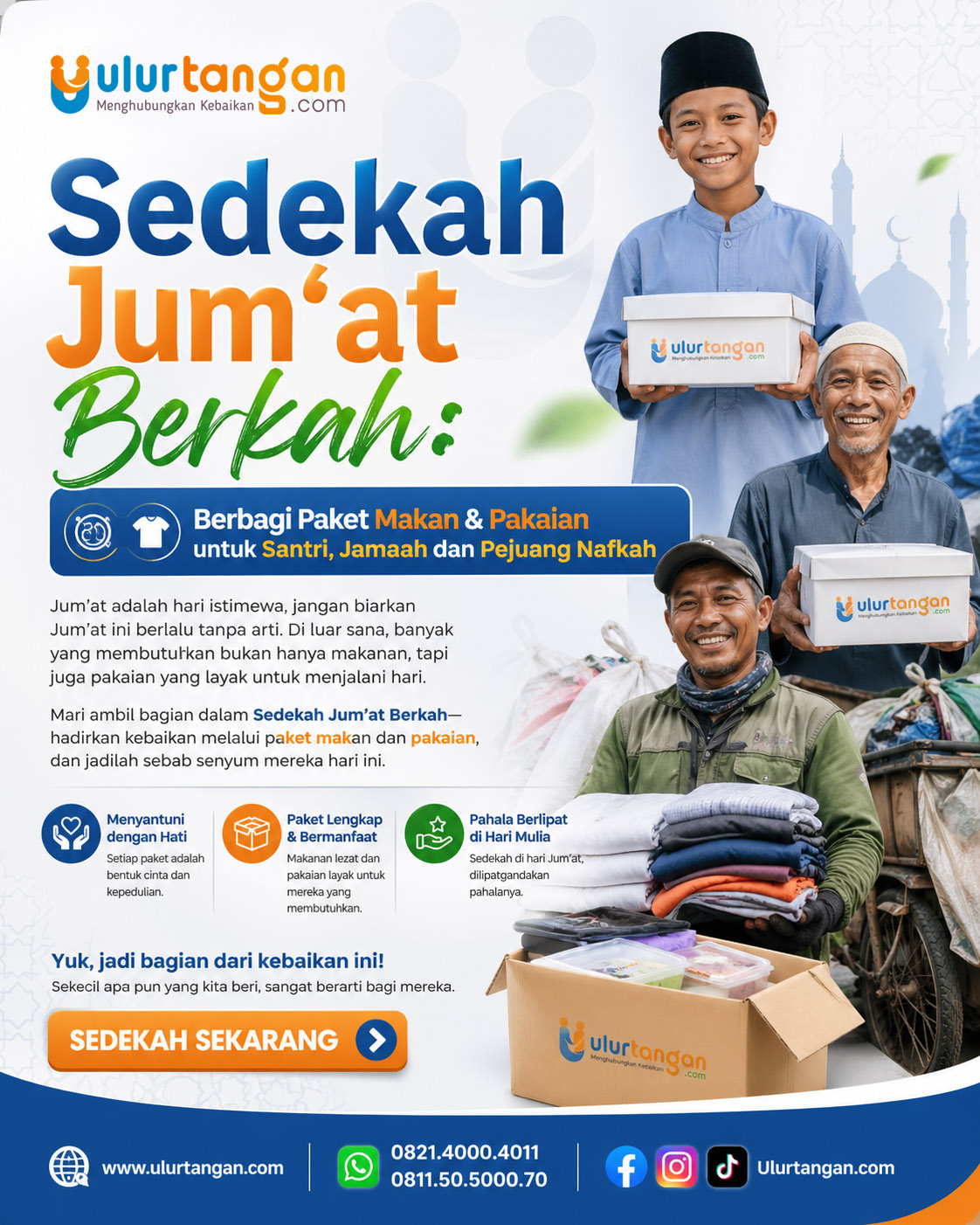 Melalui program Sedekah Jum’at Berkah, kami mengajak Anda untuk hadir membawa harapan—dengan berbagi paket makan dan pakaian, agar mereka bisa merasakan hangatnya kepedulian dan nikmatnya berbagi di hari mulia.